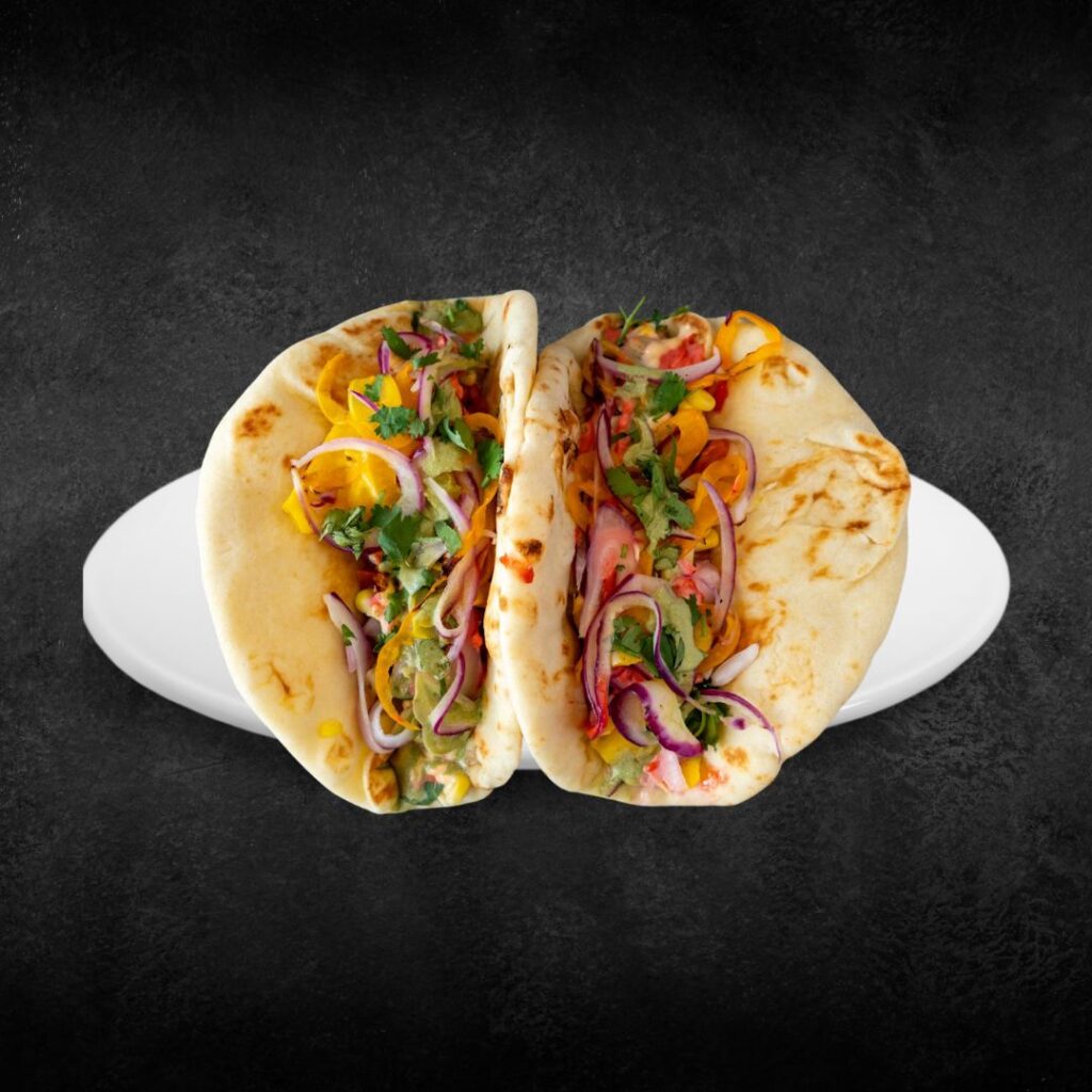 A flavorful twist on tradition — soft naan loaded with roasted veggies, seasoned beans, and a touch of spice for the perfect fusion taco.